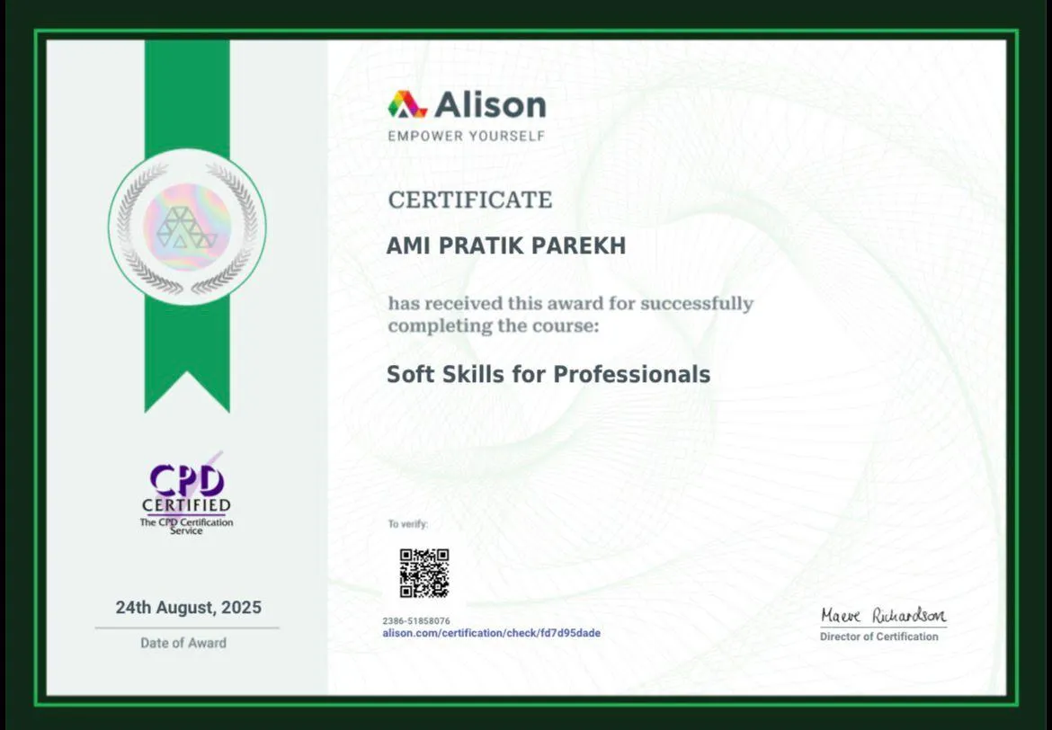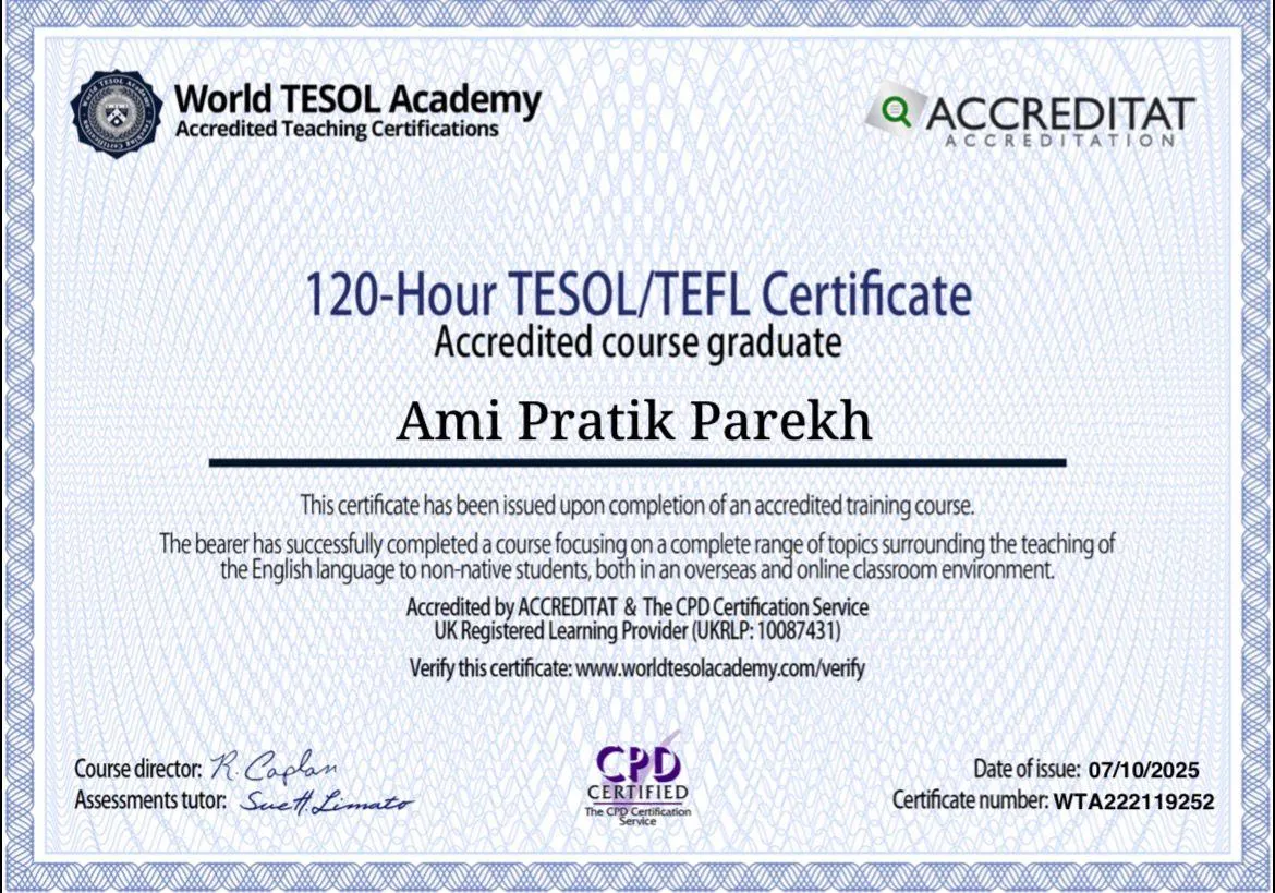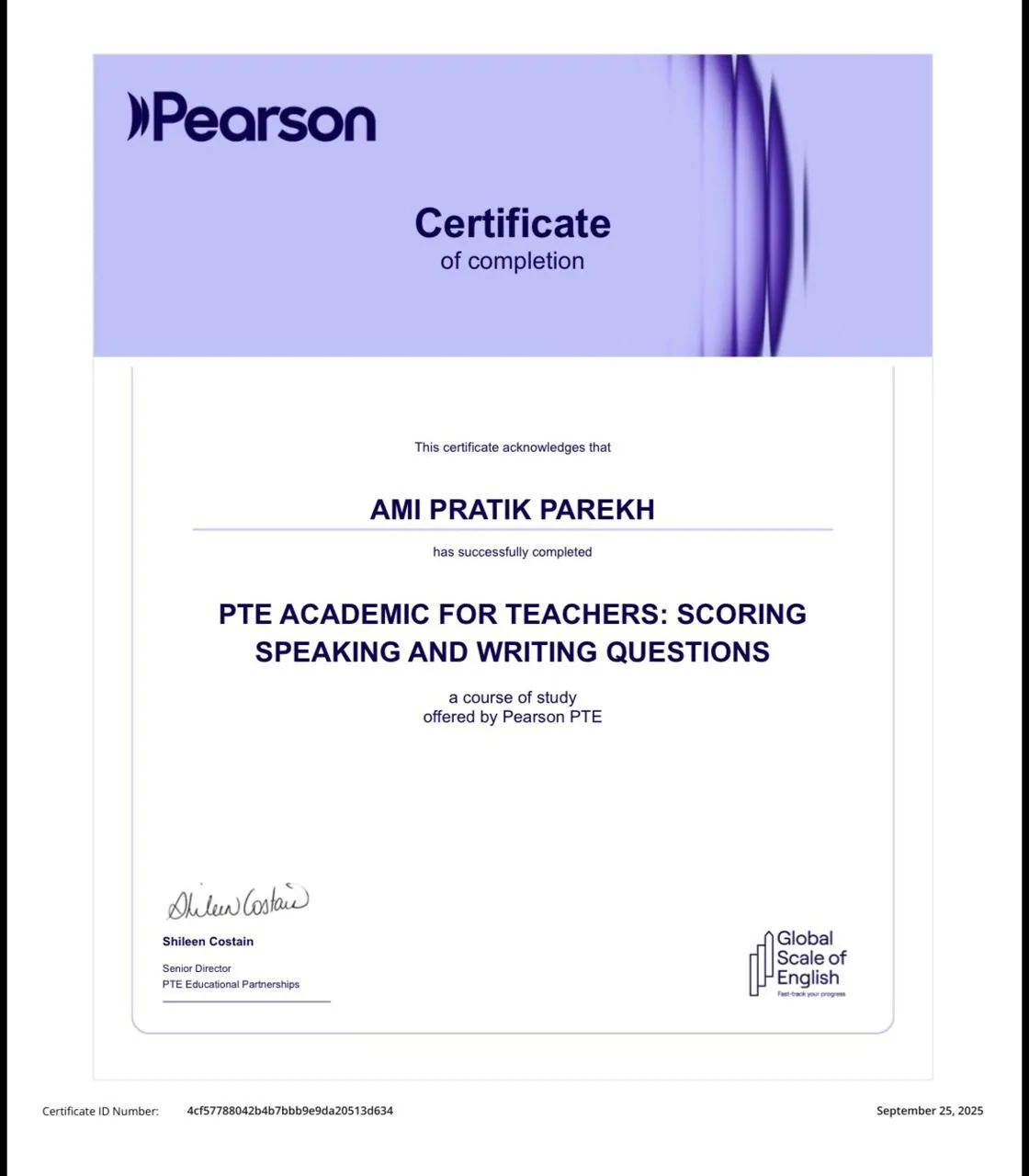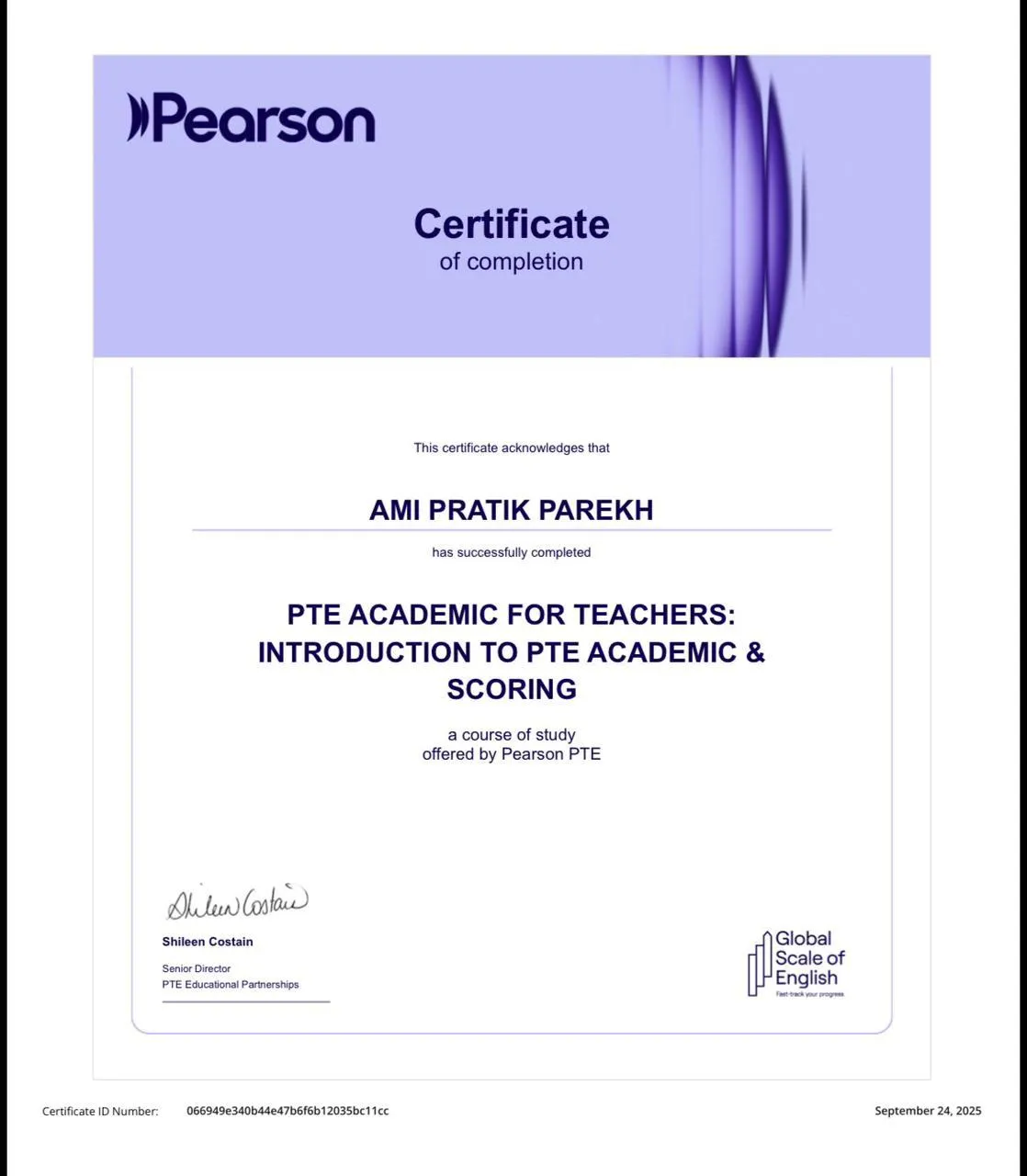 Ami Pratik Parekh is a highly experienced and certified language trainer with over 6 years of expertise in training and mentoring students across IELTS, PTE, Business English, and Spoken English. She holds globally recognized certifications including TESOL and British Council certification, along with a certification in Soft Skills from Alison, which enables her to deliver a well-rounded learning experience.